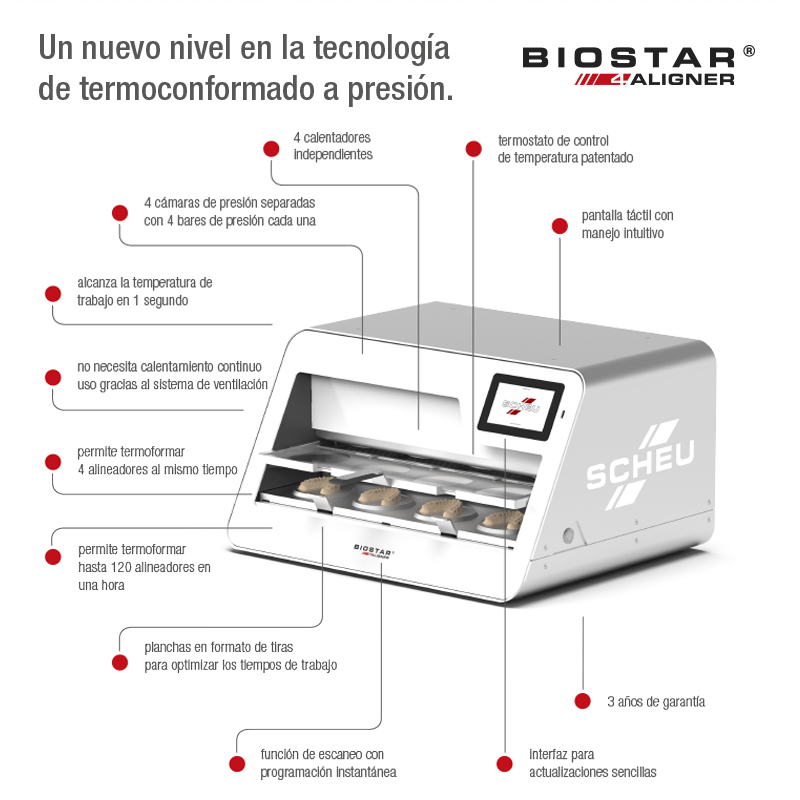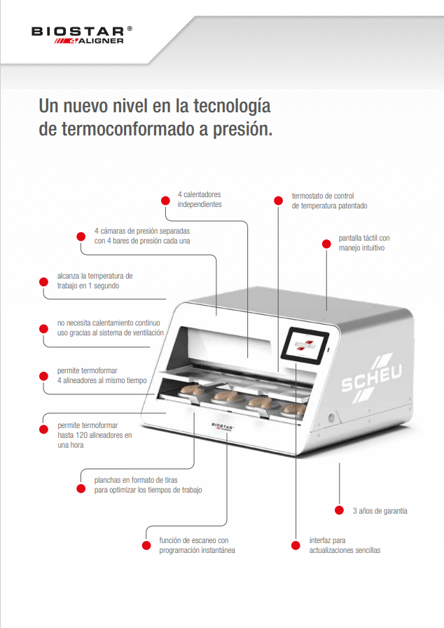 El mercado de la odontología ha experimentado un cambio significativo en los últimos años gracias al auge de los alineadores transparentes. Cada vez más pacientes buscan tratamientos discretos, cómodos y personalizados, lo que ha impulsado la necesidad de soluciones de termoformado de alta precisión. De esta necesidad nace, BIOSTAR® 4‑Aligner para alineadores transparentes de SCHEU, posicionándose como una máquina de termoconformado profesional diseñada específicamente para la fabricación de alineadores de última generación.