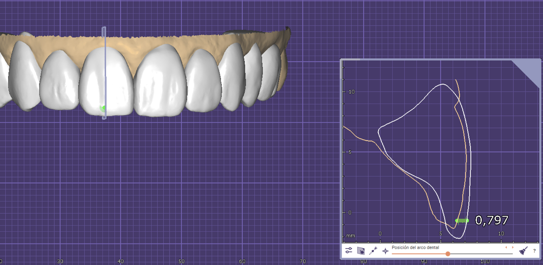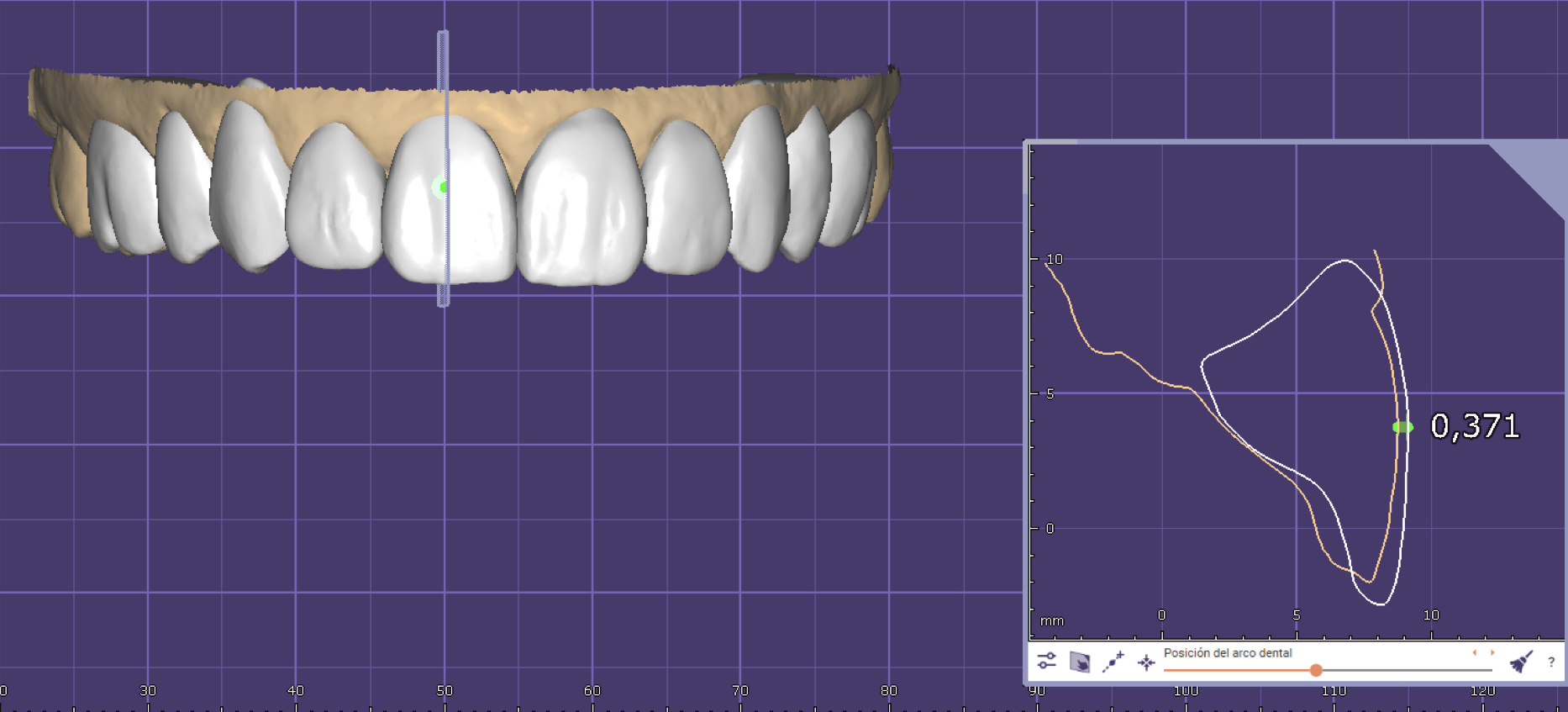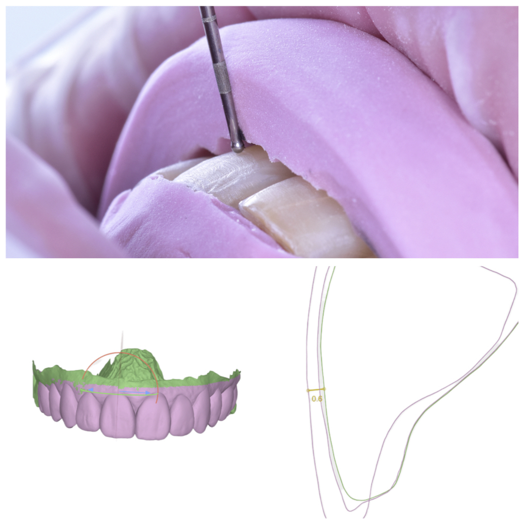 Una vez realizado el tallado sobre el paciente, se vuelve a escanear a la paciente y comprobamos superponiendo conjuntamente los stl inicial, del diseño del casos el propio tallado, para comprobar que el tallado ha sido correcto, y tener en cuenta el espesor para el cemento disponible. (fig 4) y fabricación de las carillas (fig. 4b)