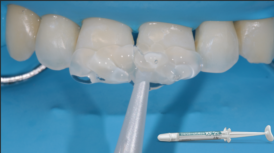 Se aplicó un desensibilizante KF 2% de FGM para reducir la sensibilidad del diente y ayuda a proteger las terminaciones nerviosas y a prevenir molestias postoperatorias.