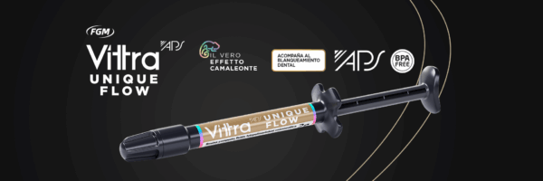 Vittra APS Unique Flow es un material que combina simplicidad y rendimiento. Su efecto camaleón agiliza la selección del color y mejora la integración estética, mientras que su fluidez controlada y su tecnología APS aportan seguridad y estabilidad durante el procedimiento. Diseñada para múltiples aplicaciones clínicas, esta resina fluida dental se convierte en una solución ideal para profesionales que buscan estética inmediata, durabilidad y eficiencia en el flujo de trabajo.